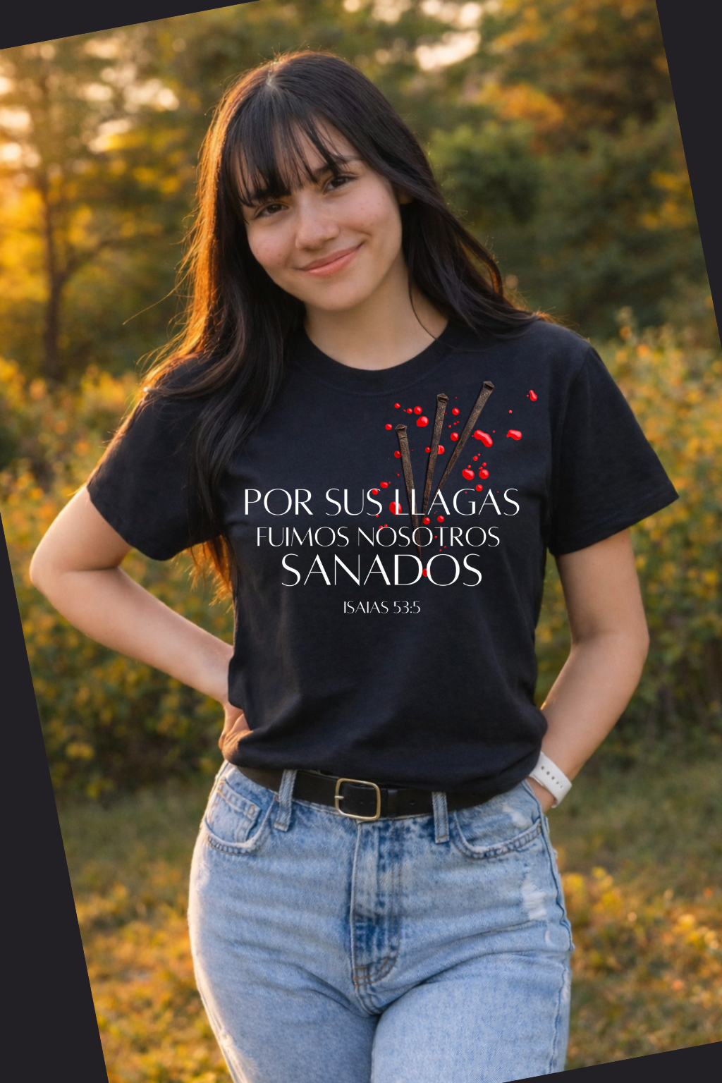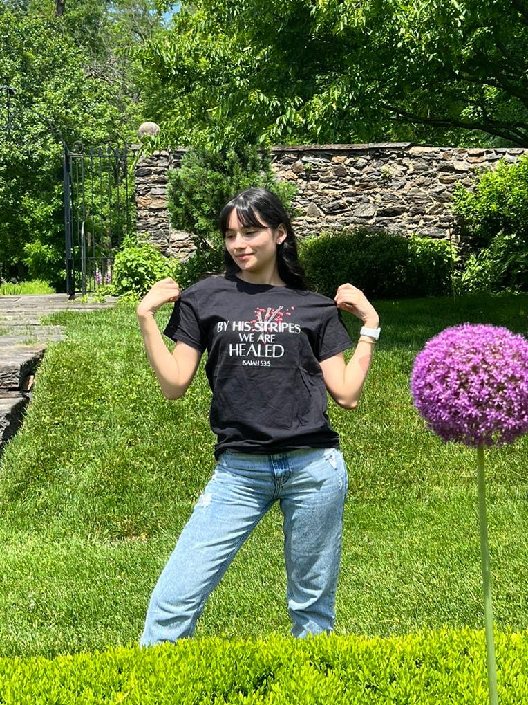 Esta camiseta es una declaración que por Las Llagas de Jesús, somos sanados. El Tee tiene los clavos de Jesús y el versículo Isaías 53:5, “Por Sus Llagas Fuimos Nosotros Sanados”. El Tee es merch oficial por la alabanza “Por Sus Llagas Fuimos Nosotros Sanados” de la adoradora internacional Isabelle Oliveras también.